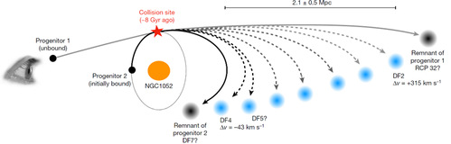 科学家提出了几种机制来解释DMDG的形成过程,其中之一是:大约 80 亿年前,两个气体丰富的矮星系,在 NGC1052 附近以 350km/s 的相对速度相撞(图 2),其中一个是被 NGC1052 束缚的矮星系,另一个则是外来闯入者。由于流体动力学相互作用,星系的高速碰撞强烈地压缩了碰撞星系所储藏的气体,并引发了恒星的爆发式形成。同时,暗物质会穿过气体,因为它仅通过引力与其他物质相互作用。因此,星系碰撞将气体和新生恒星与暗物质分开,形成了DMDG。