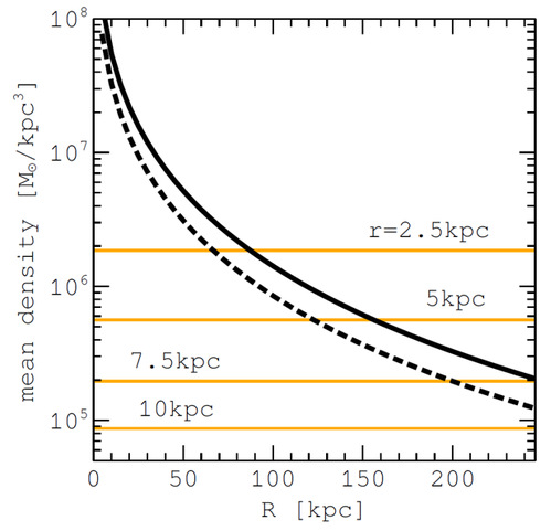 图3:平均密度的比较。暗物质缺乏星系的平均密度是其所受潮汐力(橙色线)影响大小的指标。线上也标明了距暗物质缺乏星系中心的距离 r。NGC1052 的平均密度是其潮汐力强弱的指标。根据解析模型的建议,它是作为距中心距离 R 的函数,并乘以 2.5(实心黑色)或 1.5(黑色虚线)。当NGC1052的平均密度超过球状星团所在位置的暗物质缺乏星系的密度时,球状星团将被剥离。让我们考虑一个位于 r = 5kpc 的球状星团。当缺乏暗物质的星系距离 NGC1052 中心 R = 100kpc 时,它将被剥离,而如果缺乏暗物质的星系位于 R = 200kpc,则球状星团会留在缺乏暗物质的星系内。