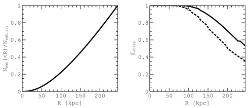 图4:(左)R 内包含的卫星星系的累积数量占总数的比率。(右)当暗物质缺乏星系位于 R 时,球状星团被剥离的比率。一半的卫星星系位于 R < 150kpc,而在那个位置潮汐力将球状星团的数量减少了 5-10 倍。