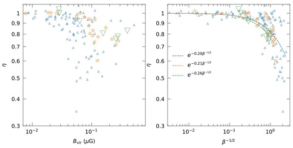 图三:重子抑制程度参数η与星系边界磁感应强度Bvir(左图)、磁流体β参数(右图)的关系。