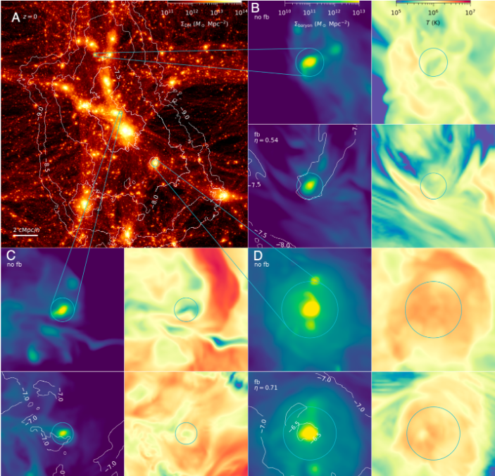 图一:A暗物质质量分布。等高线显示星系间介质的磁感应强度(单位为高斯,并以10为底取对数)。B-D展示无射电瓣(no fb)和有射电瓣反馈(fb)不同情形下,所选星系的重子物质质量和温度的分布。