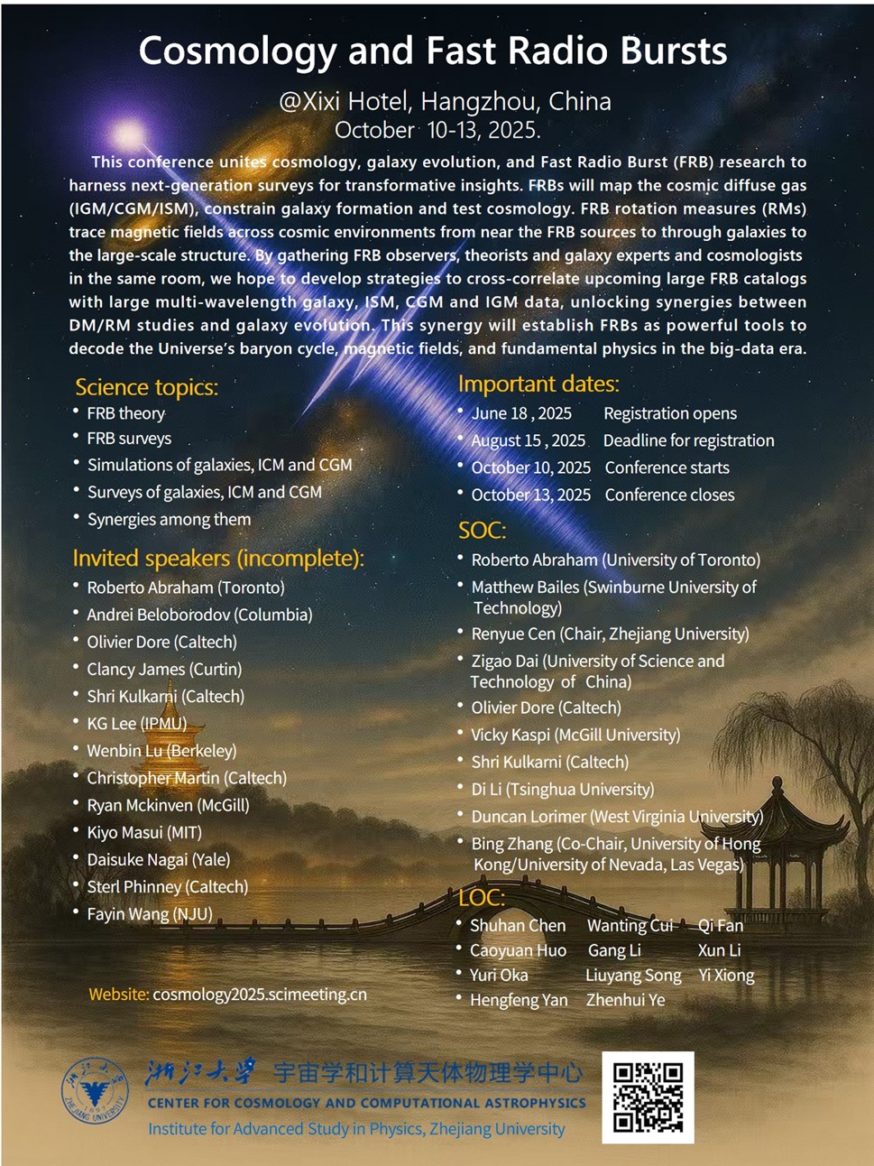 主办方浙江大学物理高等研究院、浙江大学物理学院,在基础物理研究领域具备深厚学术积淀与国际影响力,为会议的组织筹备、学术质量把控提供了全面支撑。会议学术架构明确,由浙江大学宇宙学和计算天体物理学中心主任岑人岳教授担任主席,其长期从事宇宙学、计算天体物理学研究,成果获国际学术界广泛认可,为会议议题设计、学术流程推进提供专业指导;香港大学张冰教授受邀担任联合主席,张冰教授在快速射电暴及高能天体物理现象研究领域成果突出,二人协同保障了会议学术方向的专业性与研讨深度。