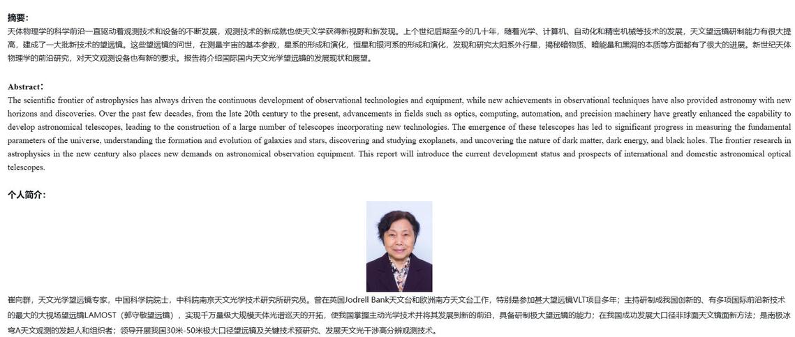 Time:Address:Speaker:Title: Current Status and Prospects of Astronomical Optical TelescopesSpeaker: Xiangqun CuiInviter: Xi KangTime: 15:30pm, December 18(Thursday)Location: Room 215, No. 8 Hainayuan Building, Zijingang Abstract:The scientific frontier of astrophysics has always driven the continuous development of observational technologies and equipment, while new achievements in observational techniques have also provided astronomy with new horizons and discoveries. Over the past few decades, from the late 20th century to the present, advancements in fields su...More -